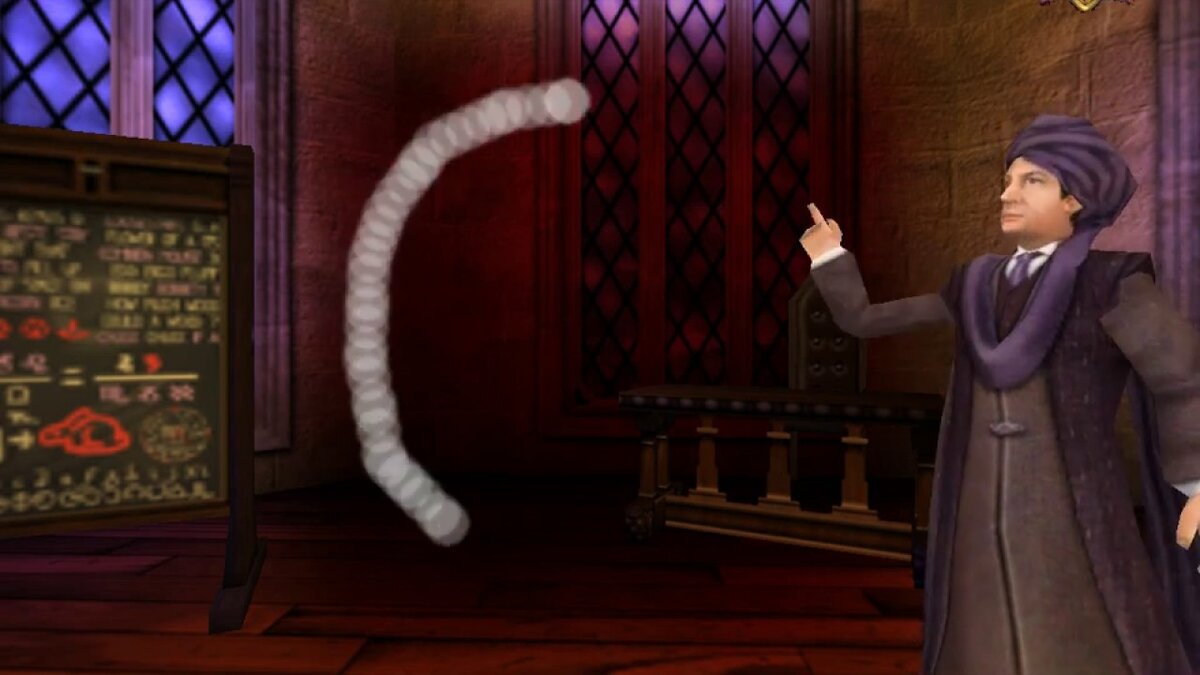 Итак нас ждет первый урок в школе. После неприятной беседы с Драко Малфоем идем прямо за ним и встречаем Гермиону, которая нас введет в курс дел. Заходим в кабинет и приступаем к занятию. Уроков, подобных этому будет не мало, так что всю суть я опишу сейчас: На каждом занятии мы будем изучать по одному заклинанию. Препод начертит контур заклинания, которое нам надо будет повторить. За каждую успешную попытку ваш факультет получает баллы. В среднем можно набрать от 30 до 50 баллов(50 если успешно завершите 4 попытку, что лично мне не всегда удавалось)