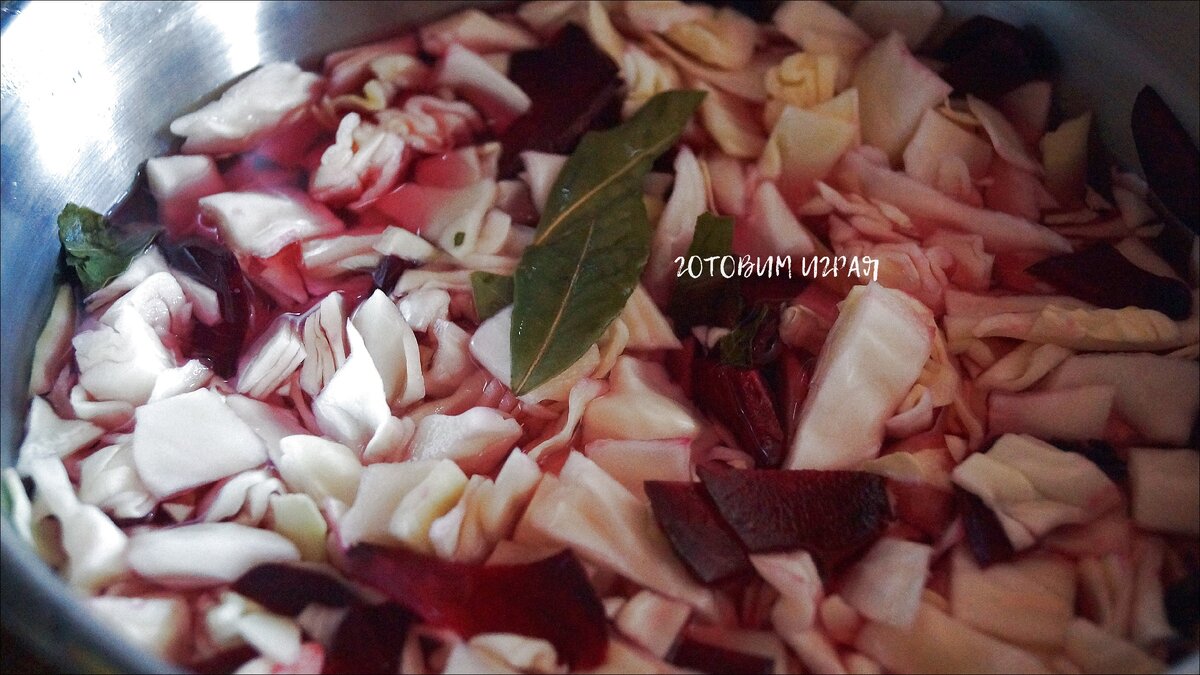 1. Капусту нарезать шашечками, свеклу тонкими полосками, зубчики чеснока на 4 части. Все это смешать в большой емкости. Туда же положить лавровый лист.
