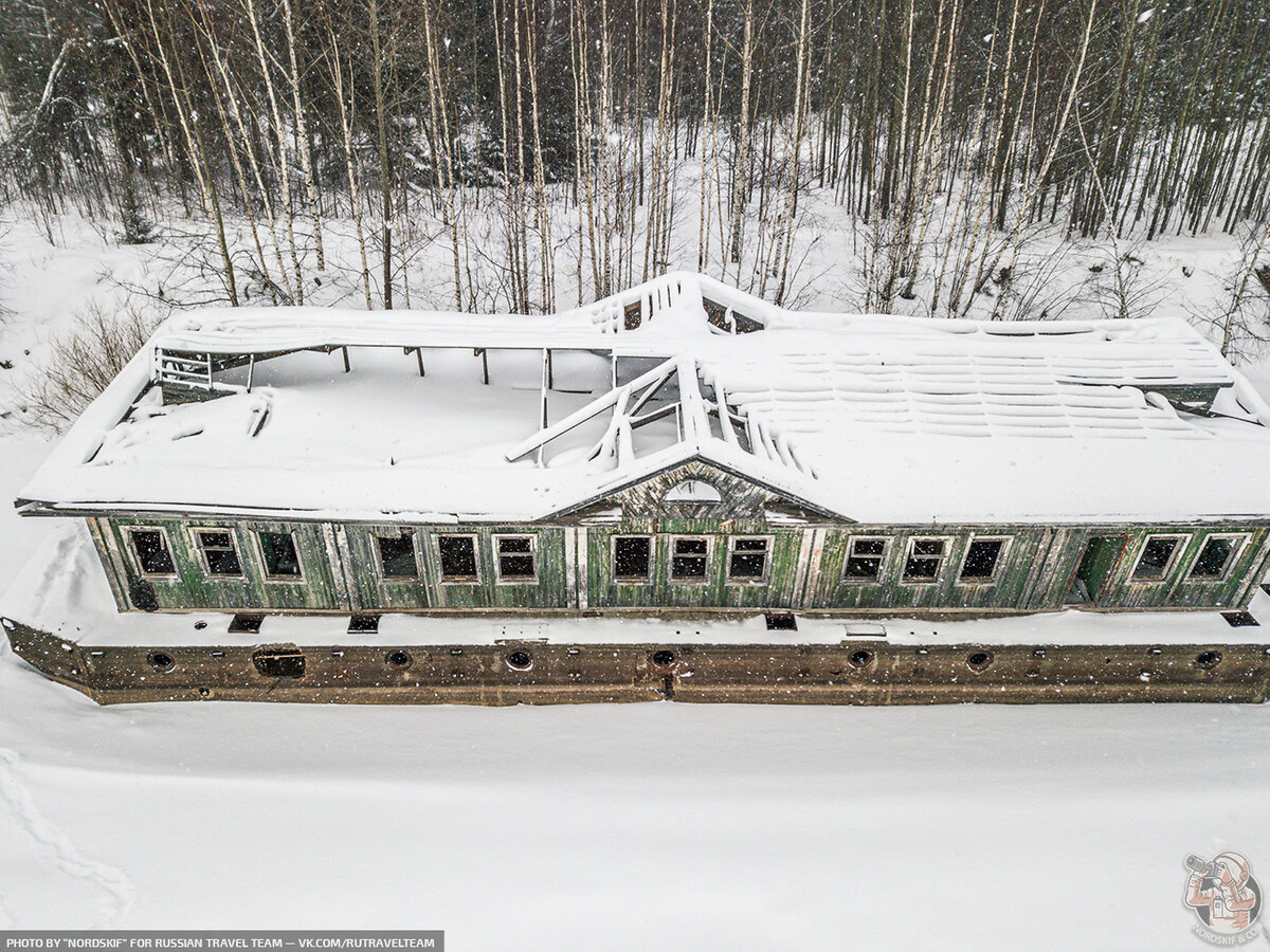 Пролетая над ремонтной базой речного флота в Закамске мне на глаза, попался брошенный у берега старый советский дебаркадер. Одинокое занесенное снегом старое судно с обвалившейся крышей — грустное напоминание о ушедшей эпохе.