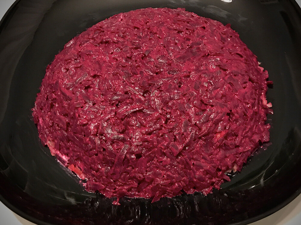Собираем салат в такой последовательности: сначала смазываем посуду майонезом. Кладем рыбу с луком, майонез, картофель, майонез, яйца, майонез, морковь. Сверху покрываем все свеклой, уже приправленной майонезом.