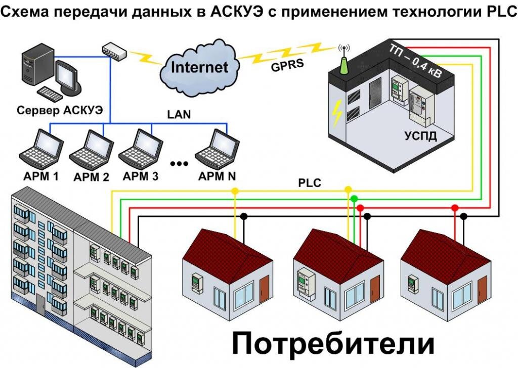 Система обеспечивает сбор, хранение, оперативное предоставление и документирование достоверных данных о потреблении электроэнергии и параметров сети, обеспечивает возможность ограничения энергопотребления каждого абонента путем предварительного задания лимитов на временные периоды, а также обеспечивает возможность удаленного отключения абонента.
