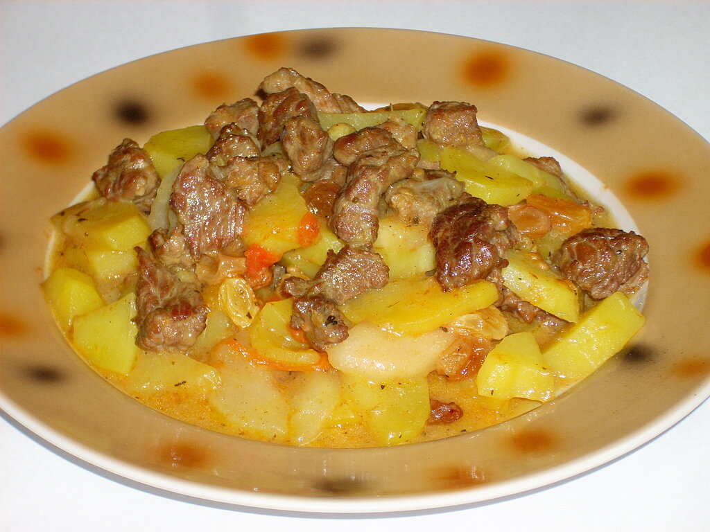 Картофель очистить, нарезать тонкими ломтиками, добавить к мясу, все тушить 15 минут. Изюм перебрать, тщательно промыть. Грушу очистить от семян, порезать дольками. Добавить фрукты в сковороду, перемешать, довести вкус солью и перцем, тушить под крышкой финальные 5 минут.