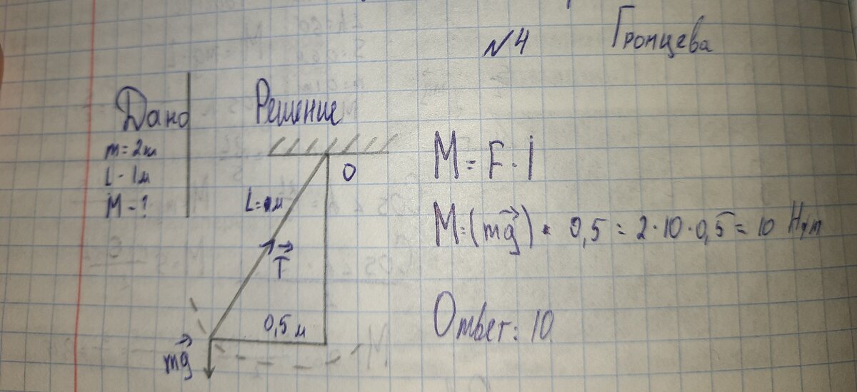 Стальной шар массой 2 кг колеблется на нити длиной 1м. Чему равен момент силы тяжести относительно оси, проходящей через точку О перпендикулярно плоскости чертежа, в состоянии, представленном на римунке?