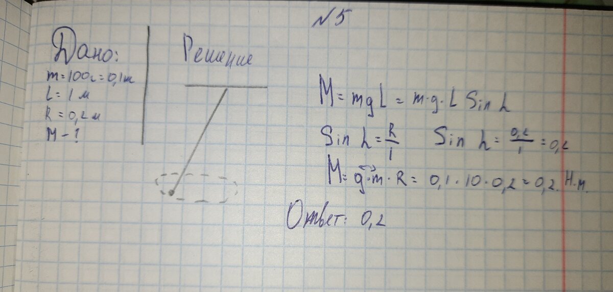 Грузик массой 100г привязан к нити длиной 1м и вращается в горизонтальной плоскости по окружности радиусом 0,2м. Чему равен момент силы тяжести относительно точки подвеса?