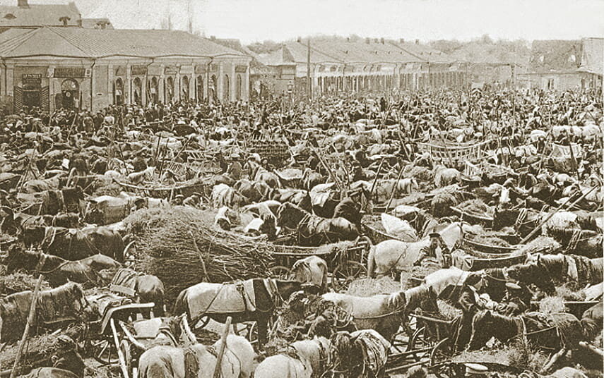В городе функционировали «волостное правление, съезд мировых судей и слуцкий попечительный о бедных комитет императорского человеколюбивого общества». А вот в торговом отношении «город не имеет большого значения: он мало оживлен ввиду отдаленности станций железных дорог». Хотя через Слуцк проходило Московско-Варшавское шоссе, находившееся в ведении министерства путей сообщения. Торги проводились два раза в неделю — в среду и пятницу. В году бывало 4 ярмарки: 9 мая, в день Святой Троицы, в девятую неделю по Пасхе и на Петра и Павла. Оборот ярмарок определяли тоже как незначительный, хотя фотография из нашей сегодняшней подборки запечатлела битком забитую ярмарочную площадь — тот случай, когда смешались в кучу кони, люди. Вообще, торговля лошадьми шла в основном на ярмарках. Слуцк имел репутацию не самого «лошадиного» региона: статистика говорила, что в конце XIX века здесь на сто жителей приходилось 16 лошадей, в то время как на Могилевщине — 24. А вот по числу рогатого скота Слуцк и уезд значились среди лидеров: 46 голов на 100 человек населения.