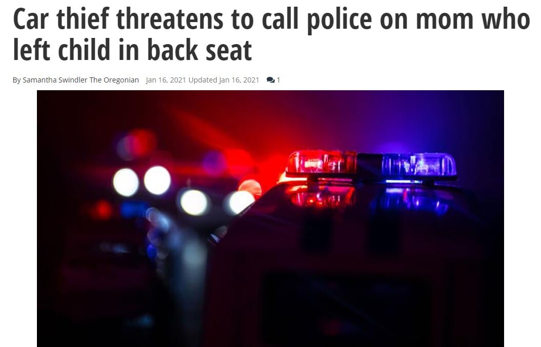 В Бивертоне (США) женщина приехала в магазин за продуктами, но не заперла машину и оставила в ней своего ребёнка. Угонщик, воспользовавшись возможностью, сел в машину и поехал.