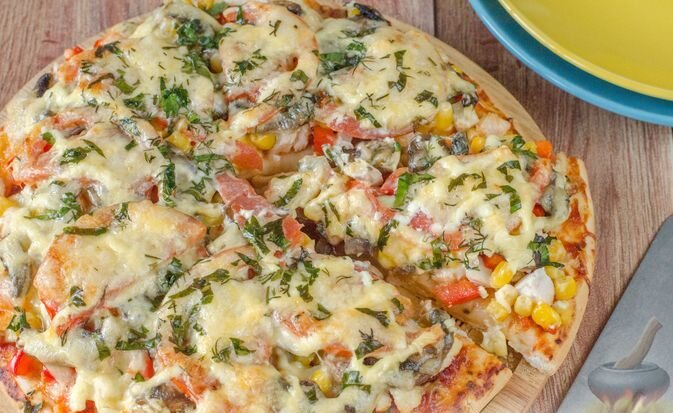 Коржи для пиццы – 2 шт. (по 170 г)Куриное филе – 250 г Кукуруза консервированная – 150 г Перец болгарский – 1 шт.Помидор – 1 шт.Шампиньоны – 200 г Сыр твёрдый – 250 г Кетчуп или томатный соус – 3 ст. ложки