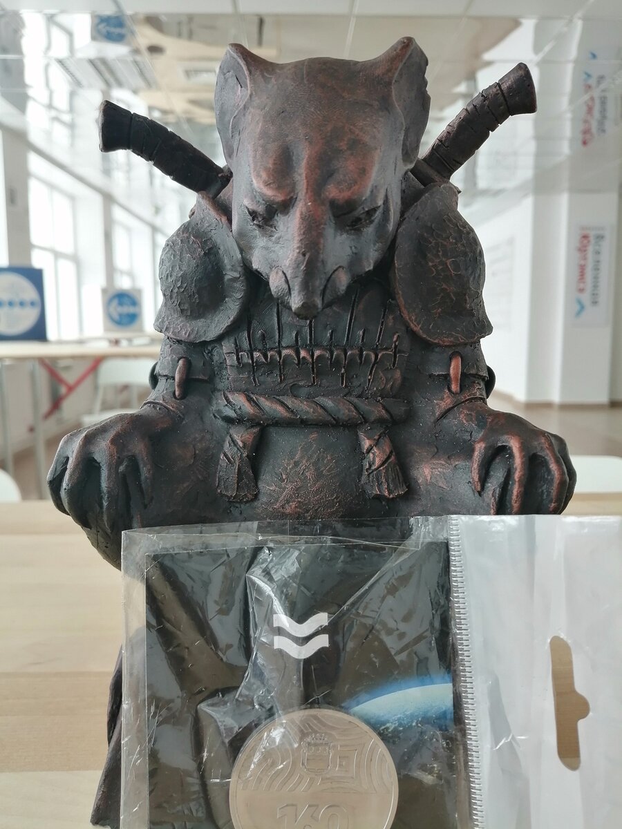 Артефакты Точки кипения БГУ. Если вы помните, то на Открытии Точки кипения БГУ одним из запоминающихся элементов были статуэтки на столах в зале "Альфа", одна из них (самая красивая, на наш взгляд) сегодня была любезно подарена Точке кипения БГУ ее автором и владельцем мастерской Тумэном Митыповым. Она станет символом Точки.Также на фото монетка из обшивки спутника, побывавшего в космосе.