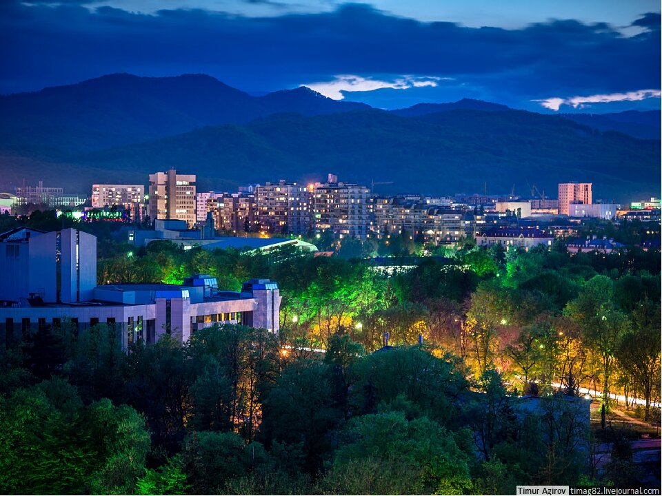 Много мест культуры: и драматические, и музыкальные театры, концертные залы. Агутин и Варум завтра дают концерт. Центральная двухкилометровая аллея городского парка особенно популярна и востребована на вечерней прогулке перед сном. Здесь – и в Нальчике в целом – принято гулять не налево и направо, а вверх и вниз. Вверх, если идёшь к горам, и вниз – если наоборот. Вид гряды огромных гор впечатляет. Даже телевышка «дышит им в пупок».