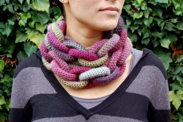 Шарф связан полностью спицами. Для начала нам нужно связать прямоугольники, а затем сшить их боковые края. Посмотрите, как это просто.