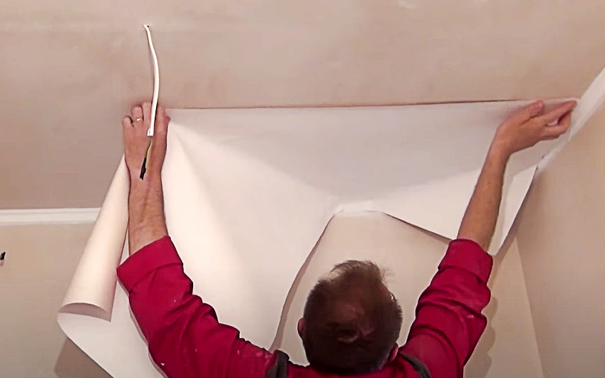 У многих также вызывает сложность оклейка области светильника, ведь обои придется вырезать. Для большего удобства, лучше заниматься потолком вдвоем.