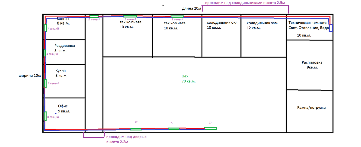 Пришел вопрос. Добрый день! Необходима помощь в проектировании системы отопления. Я не монтажник, помогаю строить цех родителям, остро встал вопрос отопления, делаем сами, но хотелось бы, чтобы все работало. После долгих разговоров на форуме и общения с блогерами особо информации больше не стало, мне нужны простые и конкретные ответы, а мне все суют названия учебников или ссылки на авторов, видимо, из за собственной неграмотности. Итак, фото цеха прилагаю. Сначала нарисовал тупиковую схему радиаторной сети, мне сказал один можно так, с заужением диаметров (я их считал), второй сказал надо делить на 2 плеча. Третий сказал делай ленинградку с большим диаметром трубы и не ошибешься. В комнате "цех" 3 радиатора по 15 секций поставлю (там и не нужна высокая температура как в офисе например, там и 18 градусов хватит). Котел 40 кВт твердотопливный. С обвязкой сам разобрался уже, но фото скину на всякий. Делать буду все сам, поэтому замудренные схемы не интересуют. Здание хорошо утеплено, 40