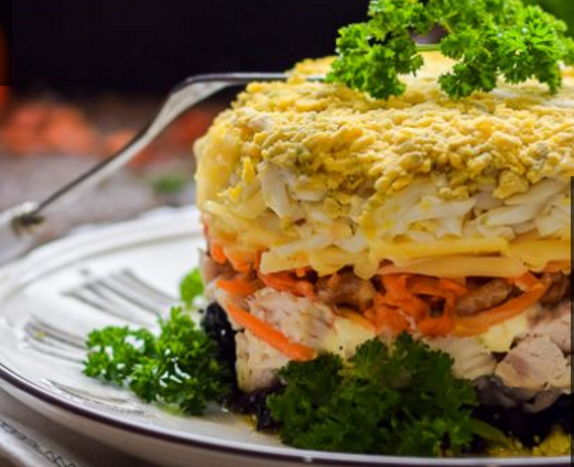 Следующий слой - морковь с орехами, сверху - готовый сырный слой и белки.