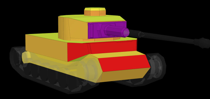 Верхняя лобовая деталь состоит из двух листов (на рисунке красные зоны). Минус в том, что здесь мало углов. Верхняя часть вообще под прямым углом, без приведенки.