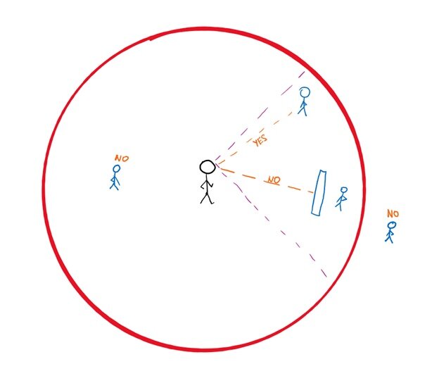 После чего выпускаем луч из объекта до другого объекта для проверки, есть ли между ними препятствия. Если препятствия есть, мы говорим объекту, что его не обнаружили.