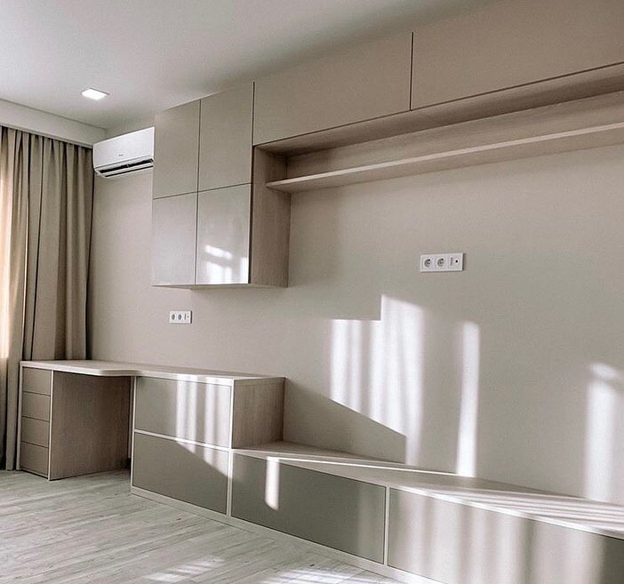 💎 Наполнение включает в себя распашные модули без ручек, стол с 4 выдвижными ящиками с направляющими скрытого монтажа с доводчиками. Ручек нет, открытие дверей нажатием.