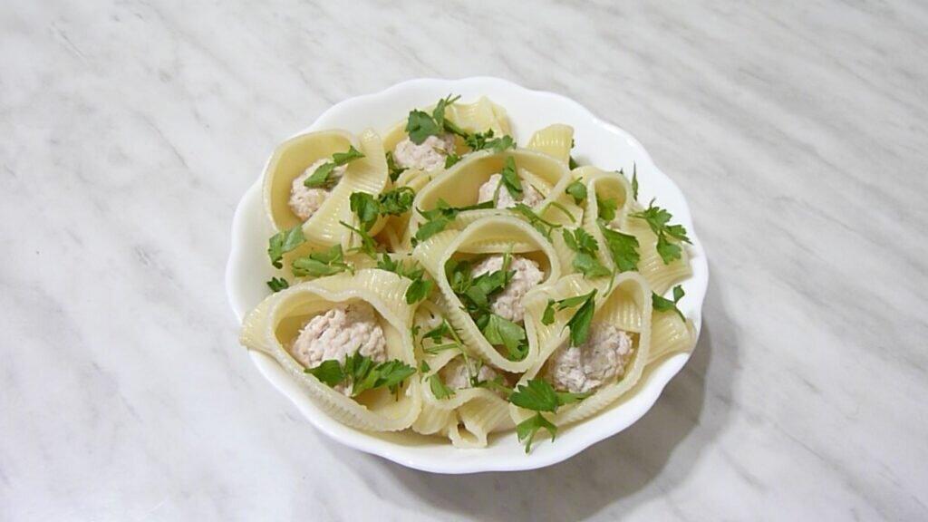 Я приготовила крупные ракушки и фарш из мяса индейки.
