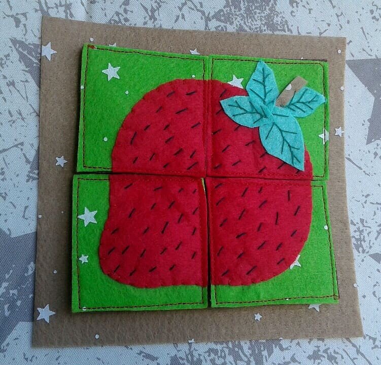 Пазл-клубничка состоит из четырёх частей. Благодаря манипуляциям с частями пазла ребенок осваивает основные пространственные характеристики положения частей пазлов относительно друг друга. Это способствует развитию пространственной ориентации и логическому мышлению.