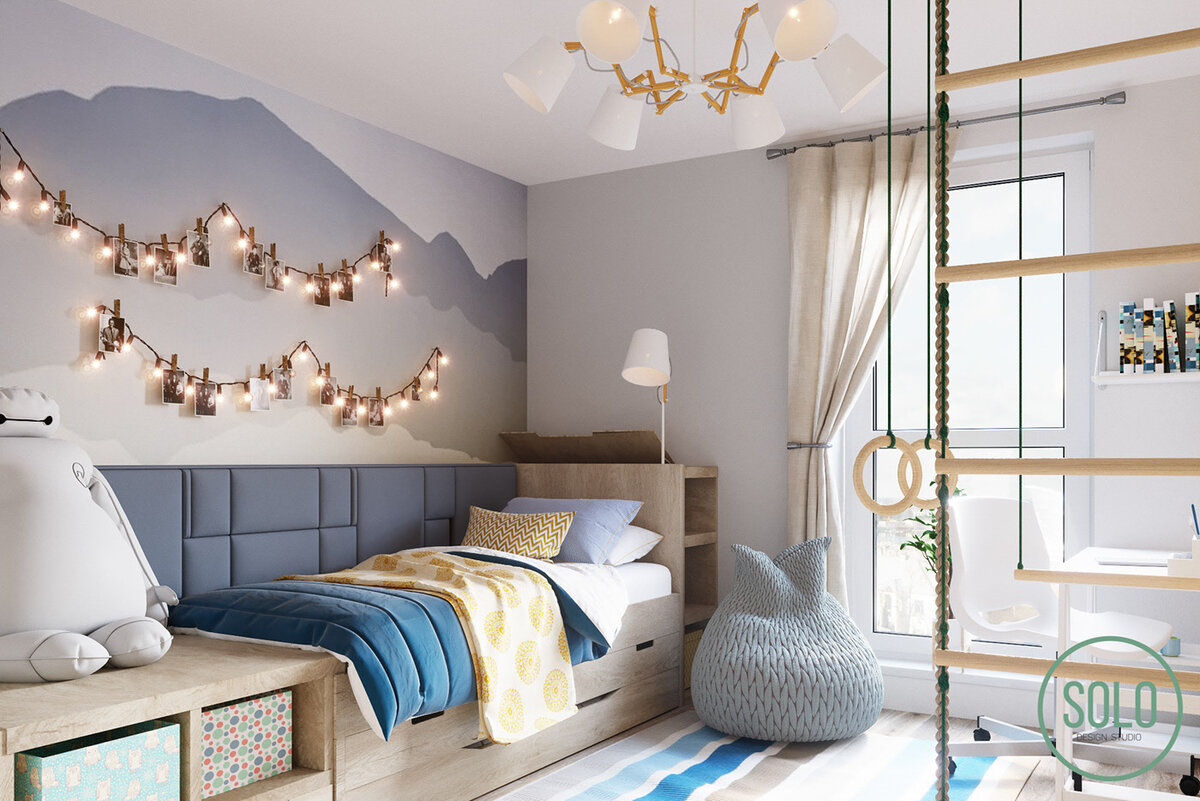 Помимо естественного освещения нужно предусмотреть несколько светильников на потолке, стенах, над кроватью и письменным столом. Для штор запрещается применять легковоспламеняющиеся материалы. А вот натуральный хлопок, лен, пластиковые жалюзи прекрасно подойдут.