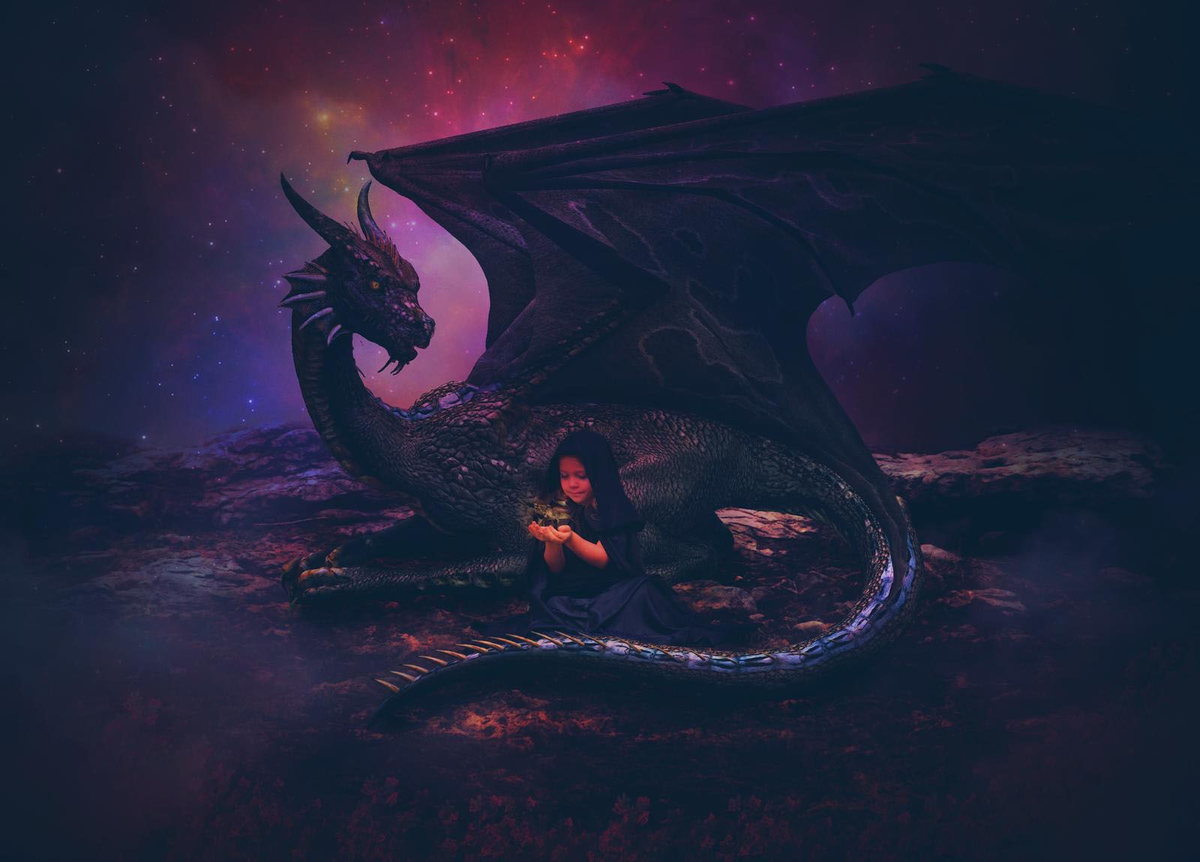 Дракон был совсем маленьким — ростом чуть больше девочки. Девочка тоже была маленькой, и ей нравился дракон — такой красивый, крылатый, с сияющими глазами…