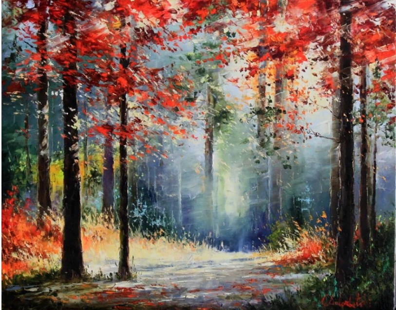 У него своя студия. Именно там, как Вы уже поняли, создает свои шедевры художник. Предпочитает работать мастихином.