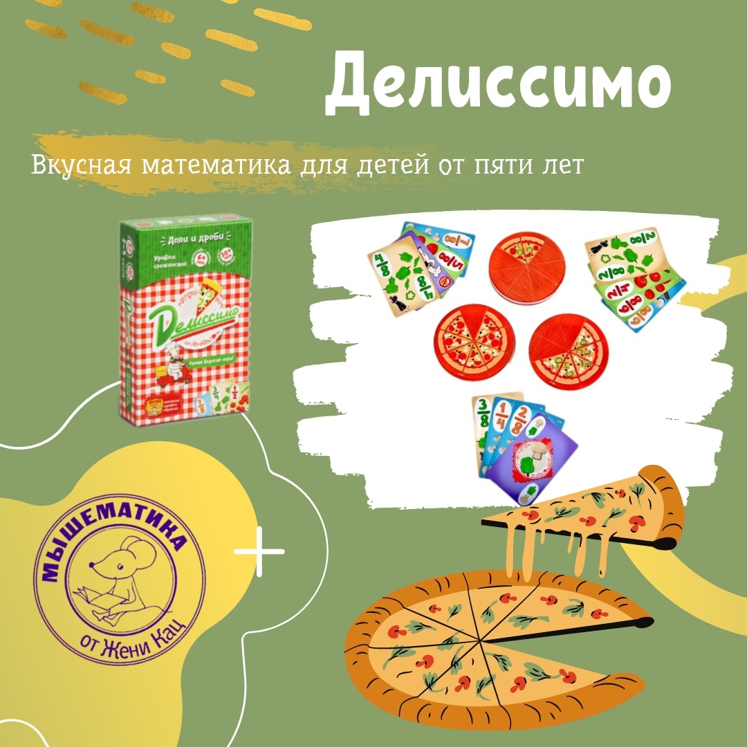 "Делиссимо" — это отличный пример наглядной математики, которая точно не вызовет вопроса "а зачем мне надо это знать?" А ещё это наша любимая игра в кафе, где мы, с одной стороны, готовим пиццу, а с другой — учимся складывать, сокращать и приводить дроби к общему знаменателю. Яркие картинки сочных кусочков пиццы помогут максимально просто и понятно визуализировать эту довольно сложную тему, так что она будет хорошо усвоена и переварена 😉