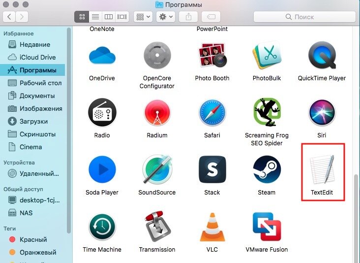 В Finder открываем программы и ищем текстовый редактор TextEdit:
