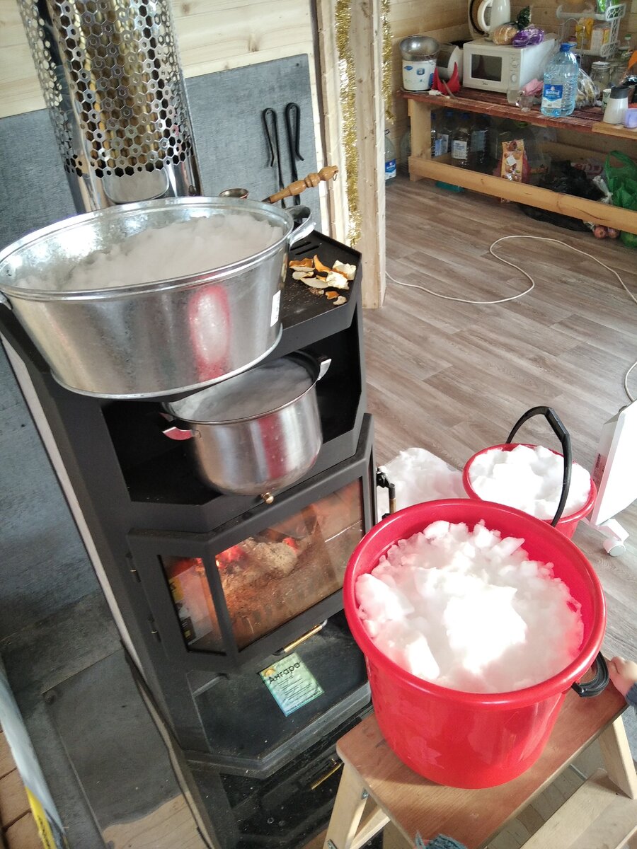 Я для себя открыла, что, во-первых, снег очень долго тает, а во-вторых, объём полученной воды оказывается примерно в шесть раз меньше объёма снега. Зато можно было сходить в туалет и помыть посуду.