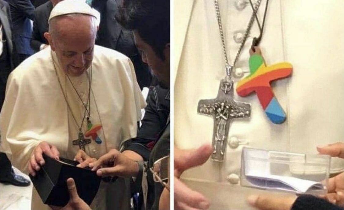 На шее у папы римского (кстати говоря гендерное определение, не порядок, нужно заменить на родитель римский) висят 2 креста: один католический с пастухом и баранами на заднем фоне (распятого Иисуса на нём нет), а другой радужный 🏳🌈, который он надел в знак солидарности извращенцами.