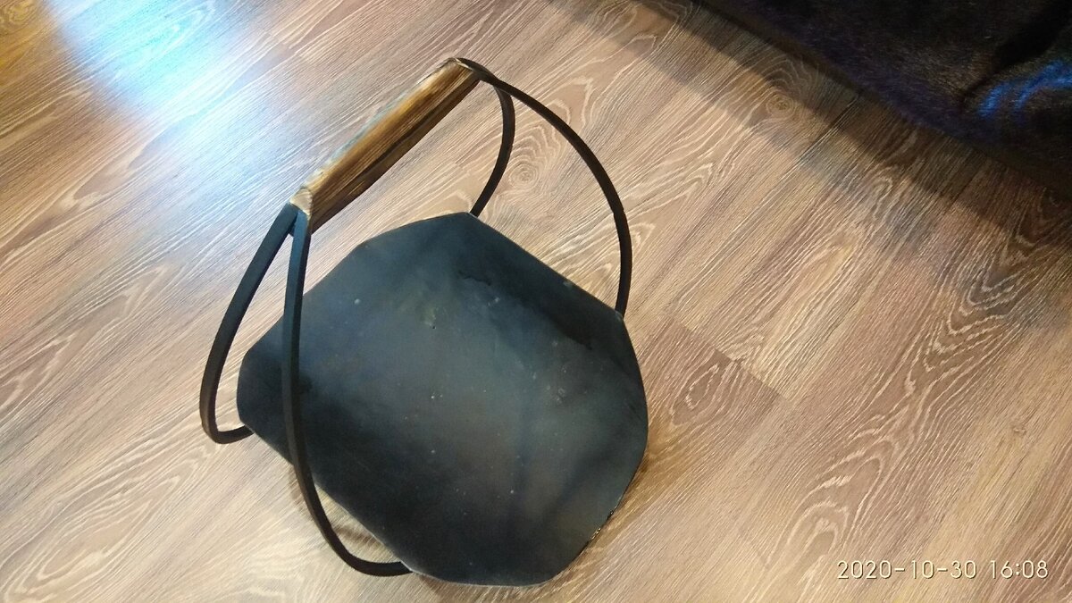 Сварил два обруча в месте, сделал деревянную ручку, положил поддон из алюминия чтоб полегче было, покрасил. Ну получилось красиво.