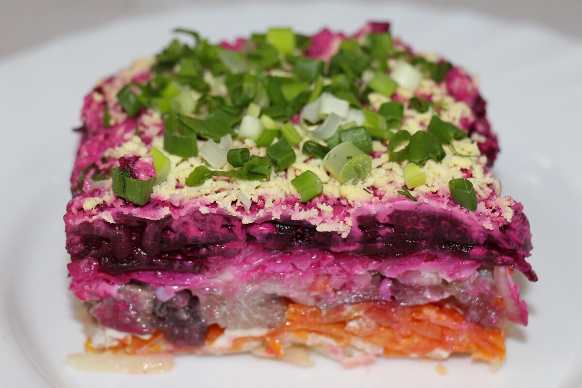 Традиционный салат состоял из измельченных тертых отварных овощей (свекла, морковь, картофель), соленого филе сельди, отварных яиц и майонезного соуса.