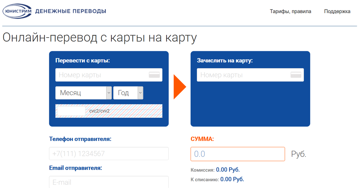Давайте рассмотрим, как перевести деньги со своей карты, на примере Unistream. В личном кабинете на сайте нужно ввести номер карточки отправителя, срок ее действия и код CVC2/CVV2 (он находится на оборотной стороне пластика). Затем следует указать номер карты получателя, его телефон, адрес электронной почты и сумму перевода.