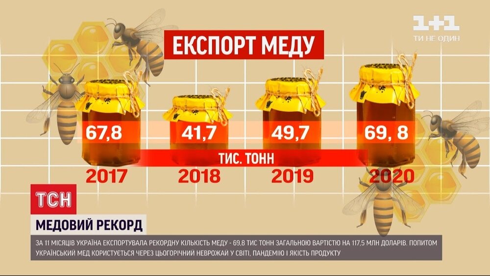 В 2020 году Украина поставила очередной рекорд в экспорте меда. За 11 месяцев было экспортировано 69,8 тыс. тонн меда на 117,5 млн долл. по 1690 долл. за тонну. Главными покупателями этого меда стали страны ЕС. Польша закупила 25%, Германия - 20%, Бельгия - 11%, США - 10% и другие страны – 34% меда. По-видимому, экспорт меда в 2020 году значительно превысил 70 тыс. тонн.