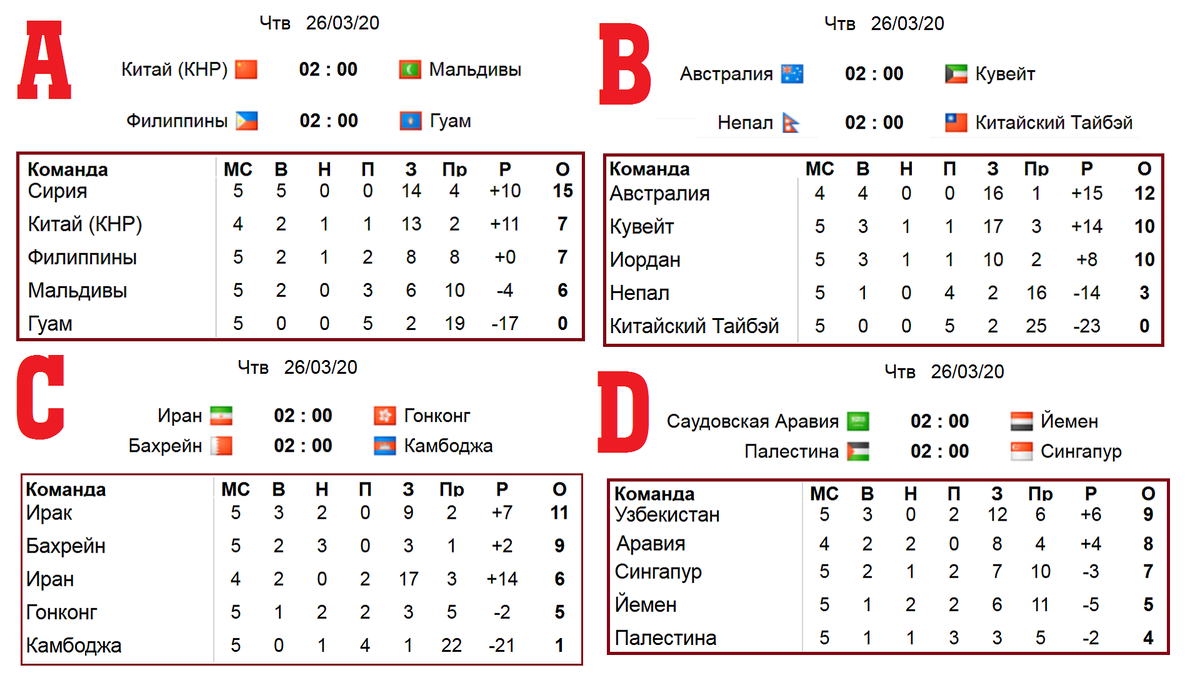 Отбор на чемпионат мира в Азии – один из самых интересных. Однако более года здесь не проводились игры. Посмотрим расклады в таблицах и узнаем, кто может досрочно вылететь из групп. В следующий раунд отбора может победитель каждой группы и четыре лучшие команды, занявшие вторые места. Всего 12 участников.