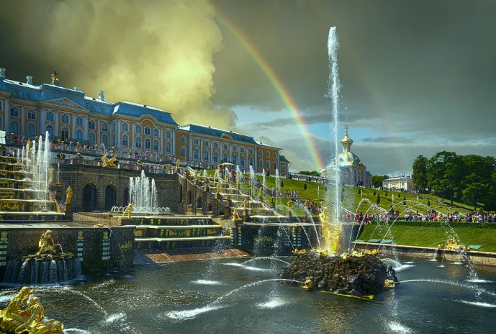 Сам дворец также изнутри украшен творческими шедеврами этих мастеров. Весной и летом экскурсия по Петергофу проходит в Верхнем и Нижнему саду, в котором самая огромная во всём мире водная система, в составе которого, только 114 фонтанов, а ещё и 3 каскада, украшенные изящными золотыми скульптурами и красотой естественной природы в этой местности.