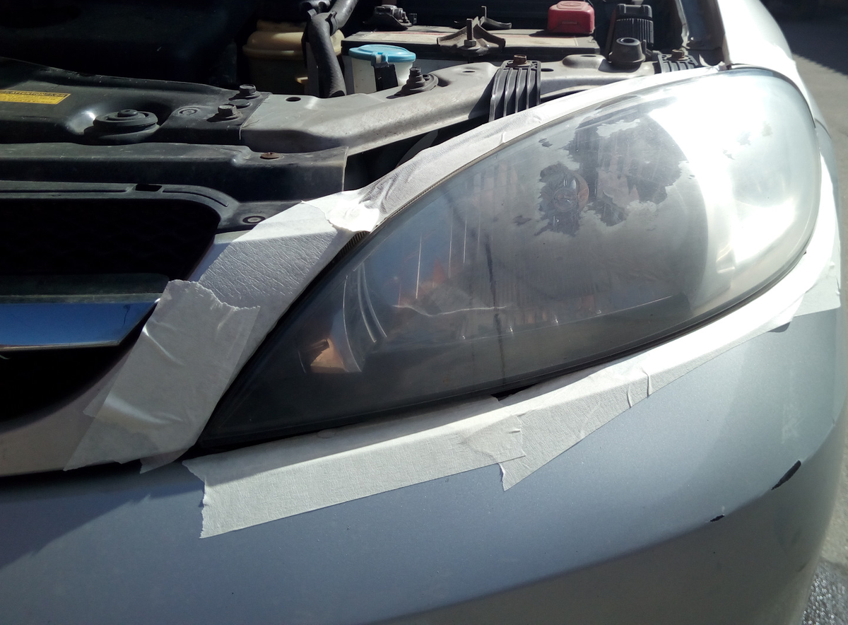 Сначала берем малярный скотч и обклеиваем все вокруг фары;