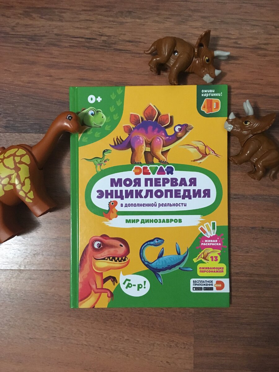 Книга шикарная. И её несомненный плюс в том, что она работает и с помощью приложения. Закачиваешь это приложение на телефон. И динозавры оживают. Моя пятилетка визжала от восторга. Динозавры не только оживают (и вы можете погладить этого динозавра, они смешно вышагивают по страничкам и подходят к книге). Но и книгу озвучивают. Женский голос расскажет вам про каждого динозавра. Вы узнаете и название динозавров, и его привычки, предпочтения в еде и т.д. Именно в таком формате энциклопедические данные и факты дети запоминают с легкостью.