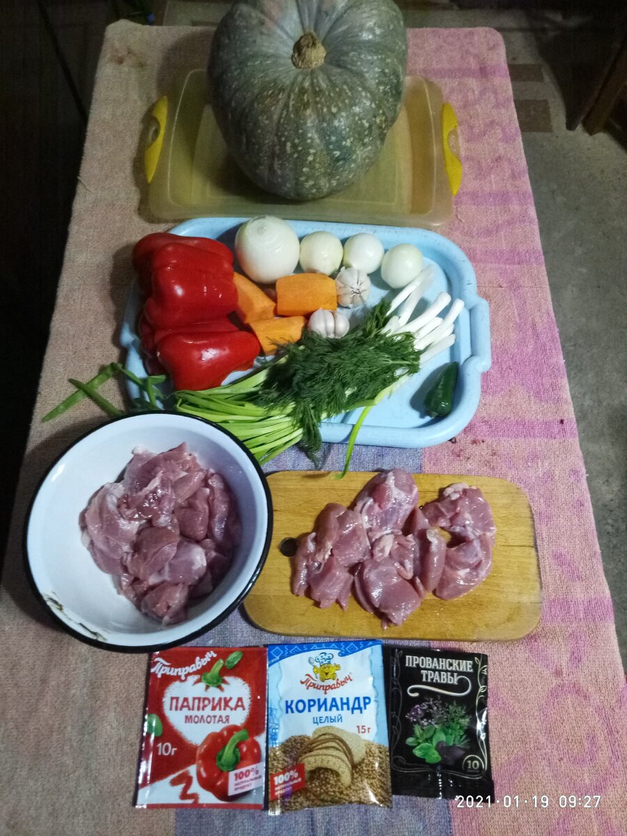 Раскладываем фольгу, на нееё помещаем нашу, вычешенную тыкву, внутрь выкадываем мясо с овощами, целиком 2 головки чеснока, нарезанный зелёный лук, 1 стручок острого перца (по желанию):