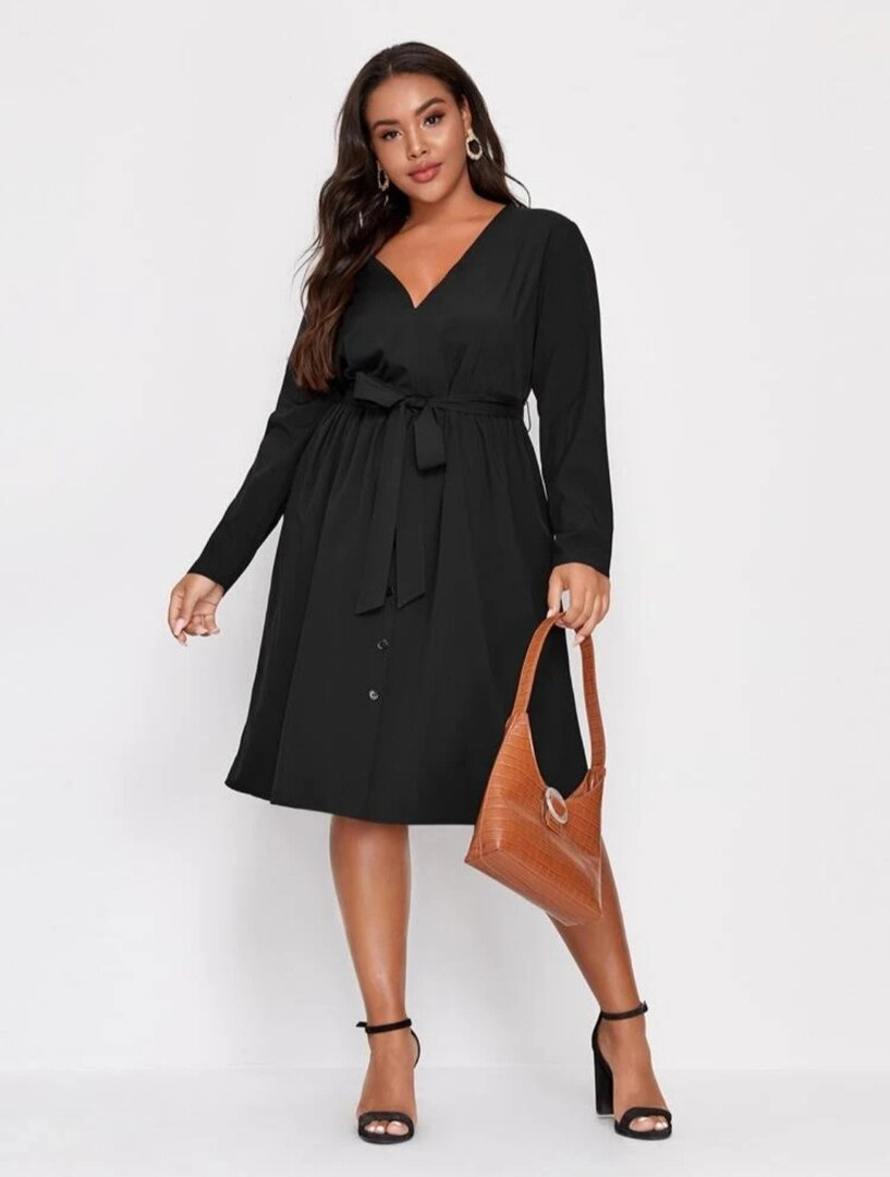 - V- образный вырез, струящиеся ткань и свободный крой облегчает зону декольте.