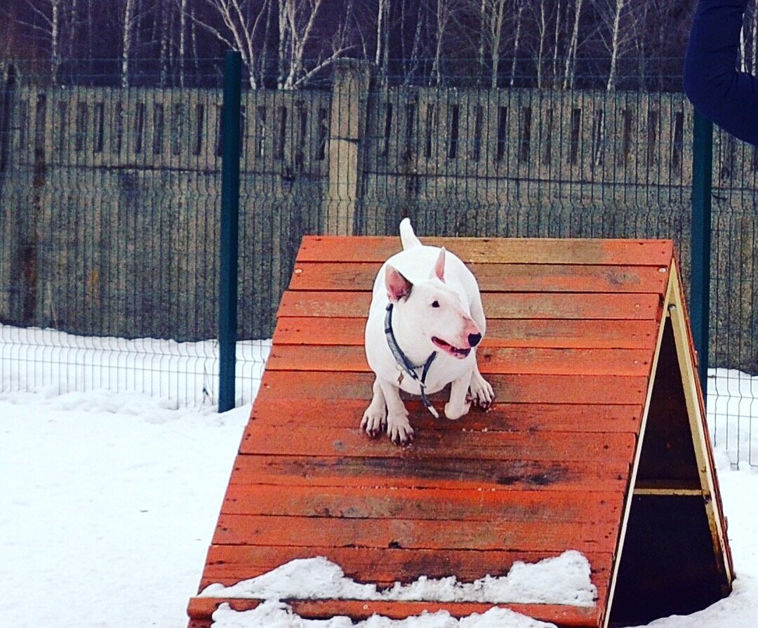 До бультерьера важно донести ,что если сейчас он сядет пятой точкой в снег ,да по вашей команде ,то вы станете самым счастливым человеком на земле.