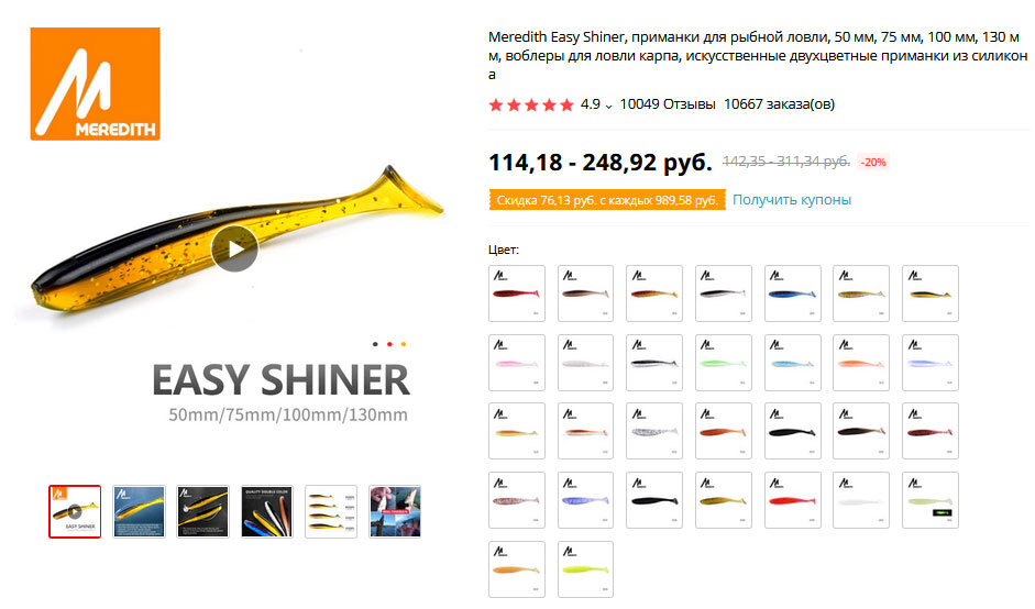 Easy shinerочень уловистый как с джиговой оснасткой, так и в вариации без огрузки. Особенно эффективно приманка работает в каролинском и техасском монтажах, оснастках типа "вэки". Подходит для ловли щуки, судака и окуня.
