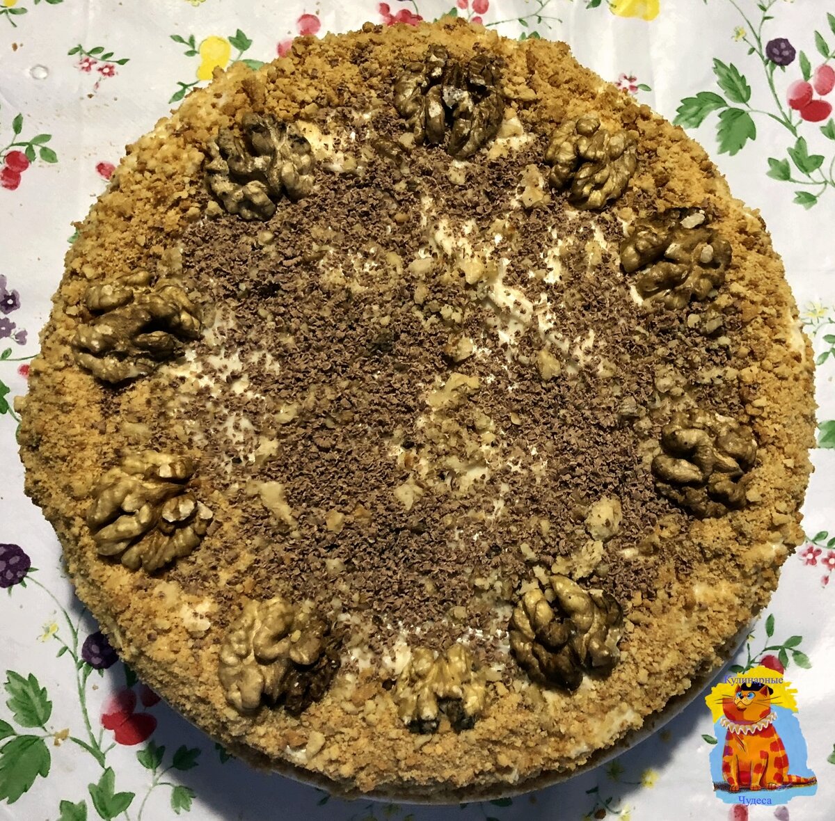 3. А теперь, волшебный момент, формирование торта. На плоское блюдо выложите 1 корж, смажьте его кремом, посыпьте грецкими орехами, предварительно обжаренными на сухой сковороде и измельчёнными на досочке.