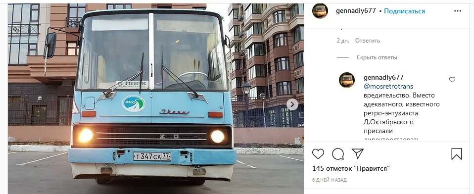 "вредительство. Вместо адекватного, известного ретро-энтузиаста Д.Октябрьского прислали директорствовать контуженного артиллериста (с отлично характеризующей его сущность фамилией, кстати). И этот "назначенный", зная мой профессионализм и трепетное отношение к Икарусу, желая сделать мне пакость, стал всячески вредить автобусу. В свою поддержку, набрал таких же случайных блатнячков-"хранителей". А после и "трипперная ксю" эстафету взяла. Автобус в результате разломан/разукомплектован, хотя и физически от него останки ещё валяются на Новооязанской, 23"