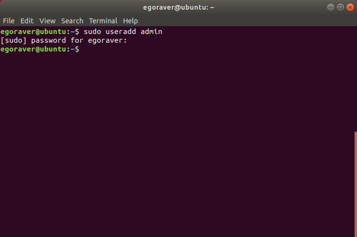 Для создания пользователя откройте Терминал и введите команду sudo useradd и укажите имя пользователя. Введите свой пароль и нажмите Enter.