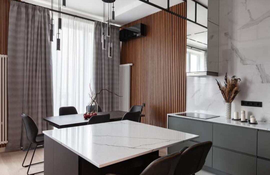 Квартиру решено поделить на две части: в одной из которых разместили кухню-гостиную и разделили кухню от гостиной барной стойкой, которая больше напоминает кухонный островок, чем барную стойкц. В гарнитур идеально встроился холодильник. В основном всю гарнитуру спрятали в шкафы, а в рабочей зоне квартиры решили избавиться от верхних шкафов, это уже моветон. Вытяжку замаскировали с помощью зеркальной панели, решили что зеркало будет уместно в данном конкретном случае, не стоит использовать его повсеместно.