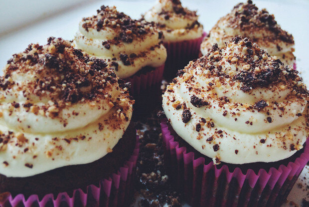 3. В получившуюся массу частями добавить муку, перемешивая миксером каждую добавленную порцию. Разлить по формам, заполняя их на 2/3 и выпекать при 180 градусах примерно 22–25 минуты или до готовности (проверить готовность зубочисткой).