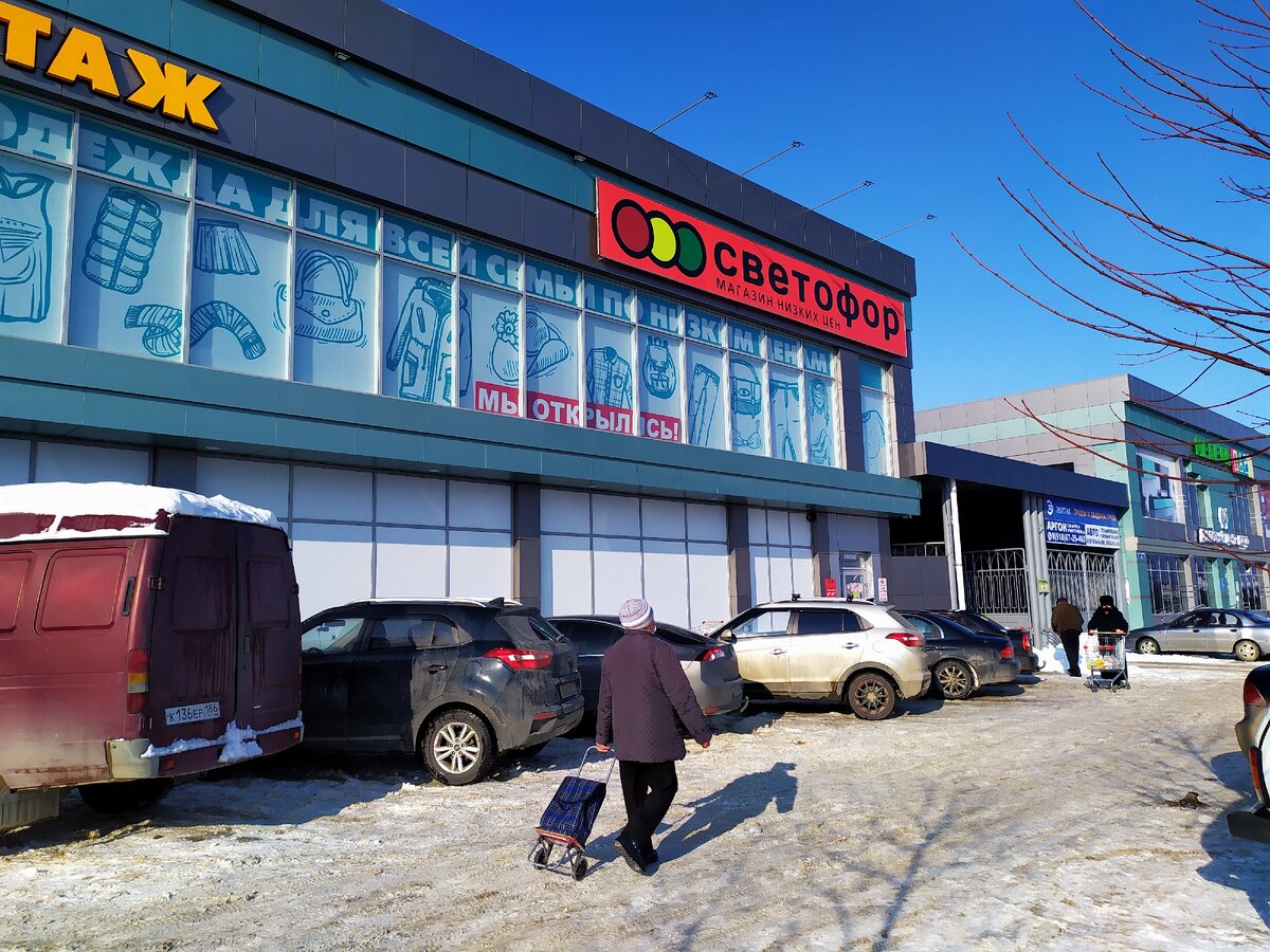 Осмотрев сегодня свой холодильник и полки на кухне, решил однозначно собраться и поехать в "Светофор". Стоянка у нас , как всегда забита автомобилями и порою просто нет места припарковать свою машину. Но мне повезло, из-за снега и гололёда практически в конце я нашёл место с кашицей. В этом обзоре предлагаю вашему вниманию некоторые продукты и товары, которые попались мне на полках магазина