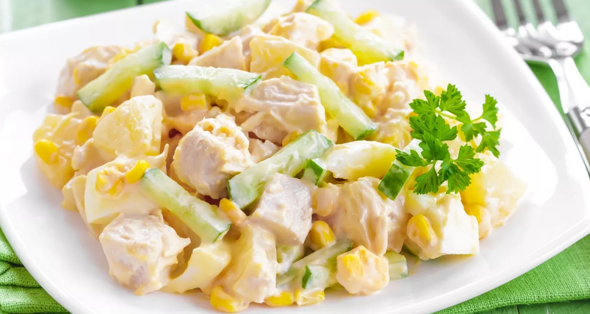 Всем привет. Из копченого куриного мяса, сладкой кукурузы, а также полутвердого сыра можно приготовить питательный и простой салат, а для того, чтобы он получился ароматным, в него желательно добавить чеснок или чили перец.