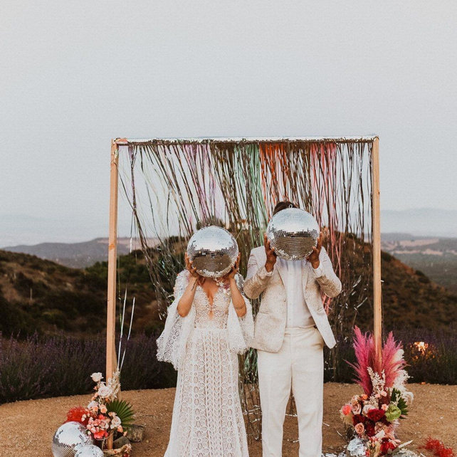 Зеркальные шары ассоциируются с дискотекой, эпохой 70-х и безудержным весельем. Поскольку стиль бохо и эстетика 70-х сейчас на пике свадебной моды, диско-шары в декоре праздника будут как нельзя кстати. Немного гламура ещё никому не повредило, поэтому смело добавляйте мерцающие шары в вашу свадебную концепцию, даже если предпочитаете классический или любой другой стиль. А для гранжевой, хиппи или винтажной вечеринки такая деталь декора просто обязательна!