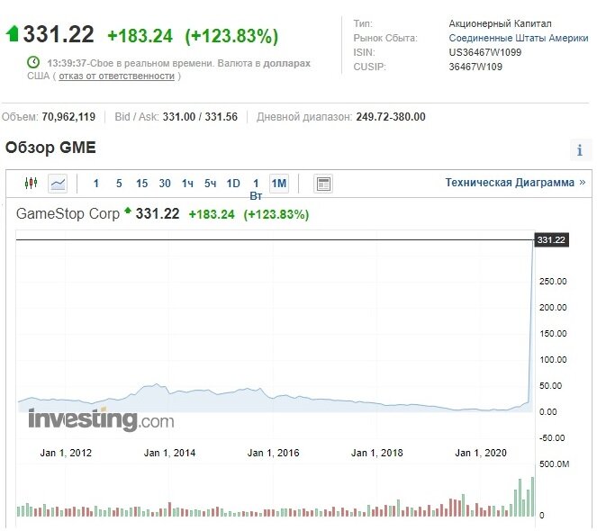 Акции компании GameStop, владеющей сетью игровых магазинов за 2 месяца резко взлетели в цене.